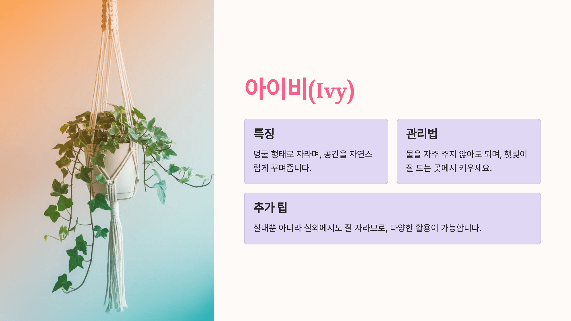 - 특징: 덩굴 형태로 자라며, 공간을 자연스럽게 꾸며주는 아이비는 초보자에게도 인기가 많습니다.