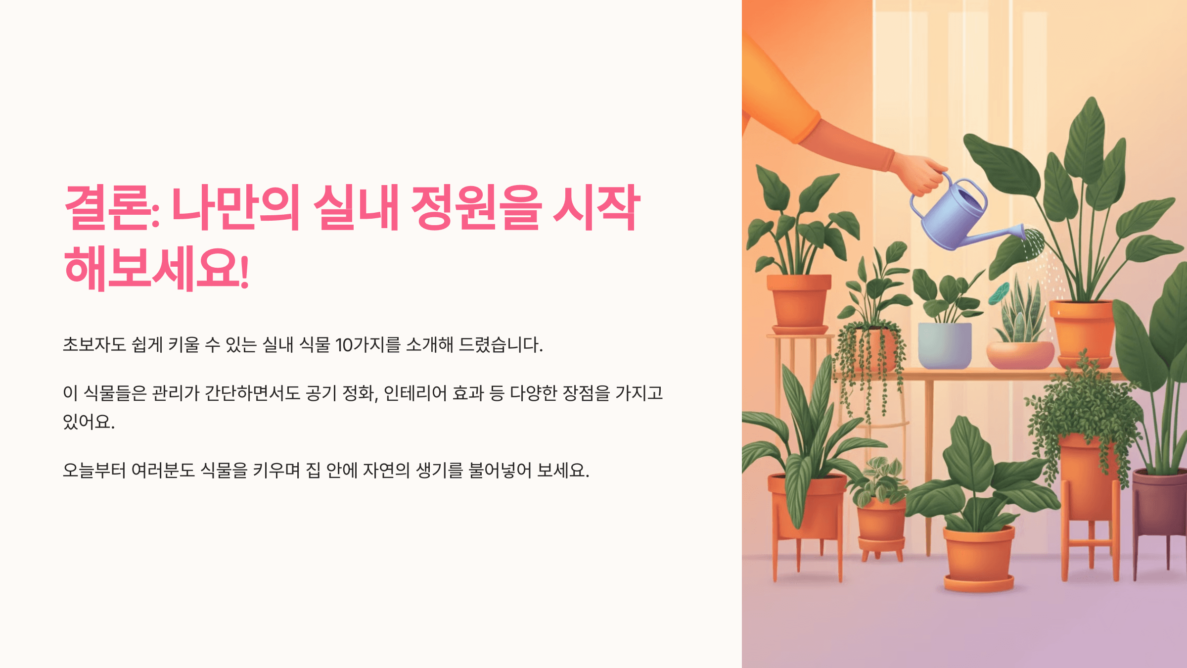 초보자도 쉽게 키울 수 있는 실내 식물 10가지를 소개해 드렸습니다. 이 식물들은 관리가 간단하면서도 공기 정화, 인테리어 효과 등 다양한 장점을 가지고 있어요. 오늘부터 여러분도 식물을 키우며 집 안에 자연의 생기를 불어넣어 보세요. 🌟