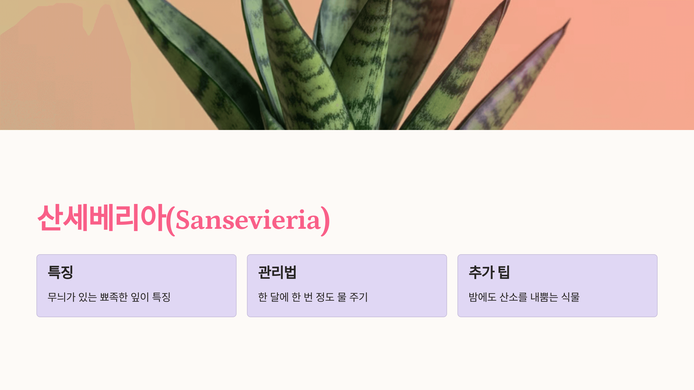 - 특징: 산세베리아는 무늬가 있는 뾰족한 잎이 특징으로, 초보자들이 가장 선호하는 식물 중 하나입니다.