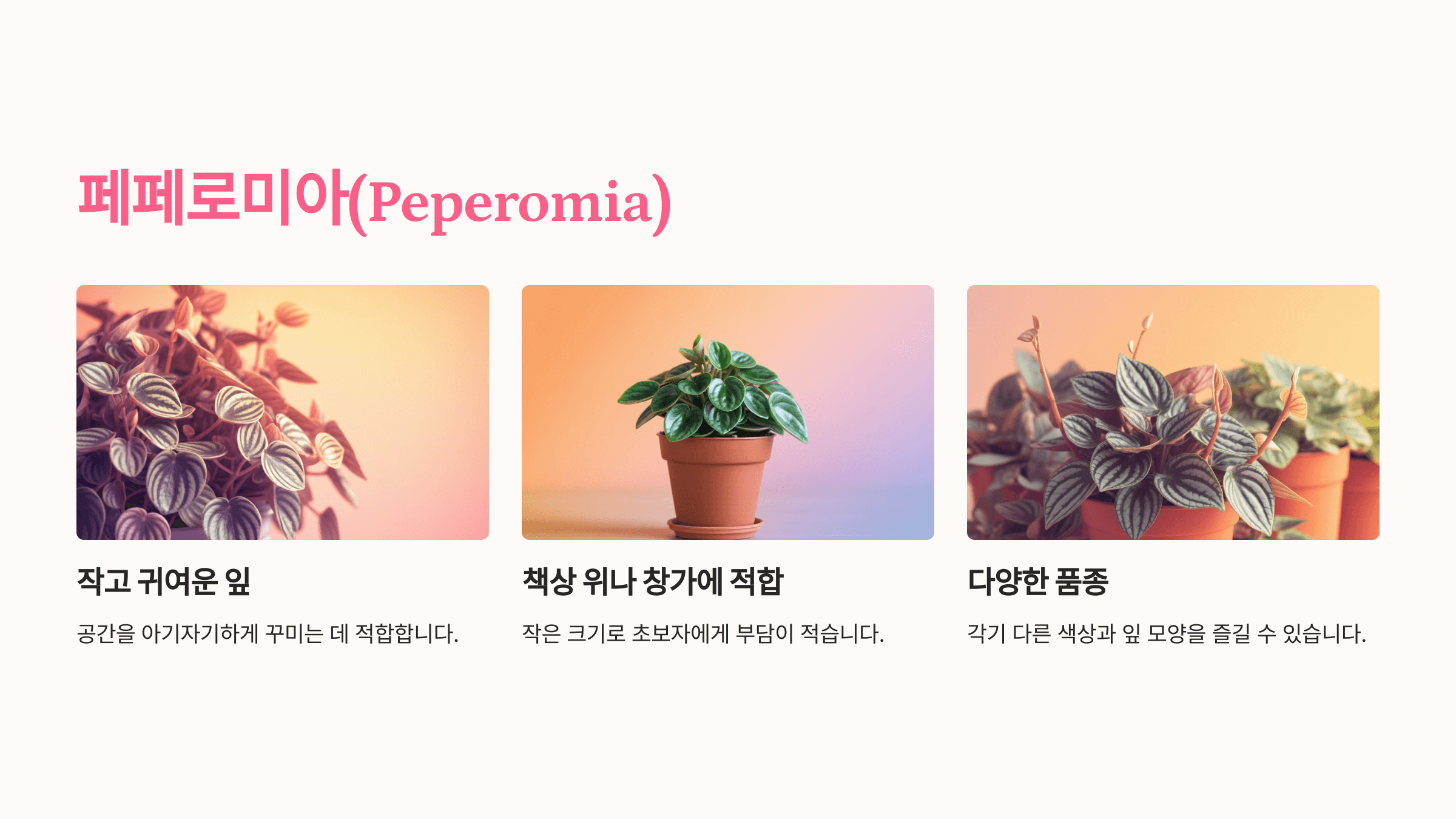 - 특징: 작고 귀여운 잎이 특징인 페페로미아는 공간을 아기자기하게 꾸미는 데 적합합니다.